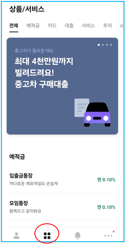 모임계좌 개설을 위해 카카오뱅크 어플을 실행하면 아래쪽에 작은 네모가 모여있는 버튼이 보입니다.